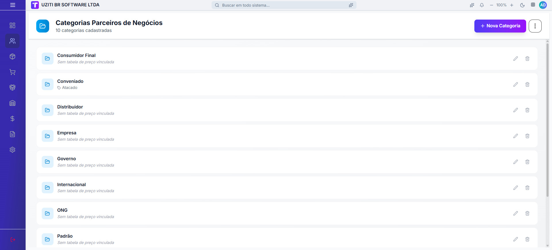 - Lista de categorias com nome, tabela de preço vinculada e ações por linha