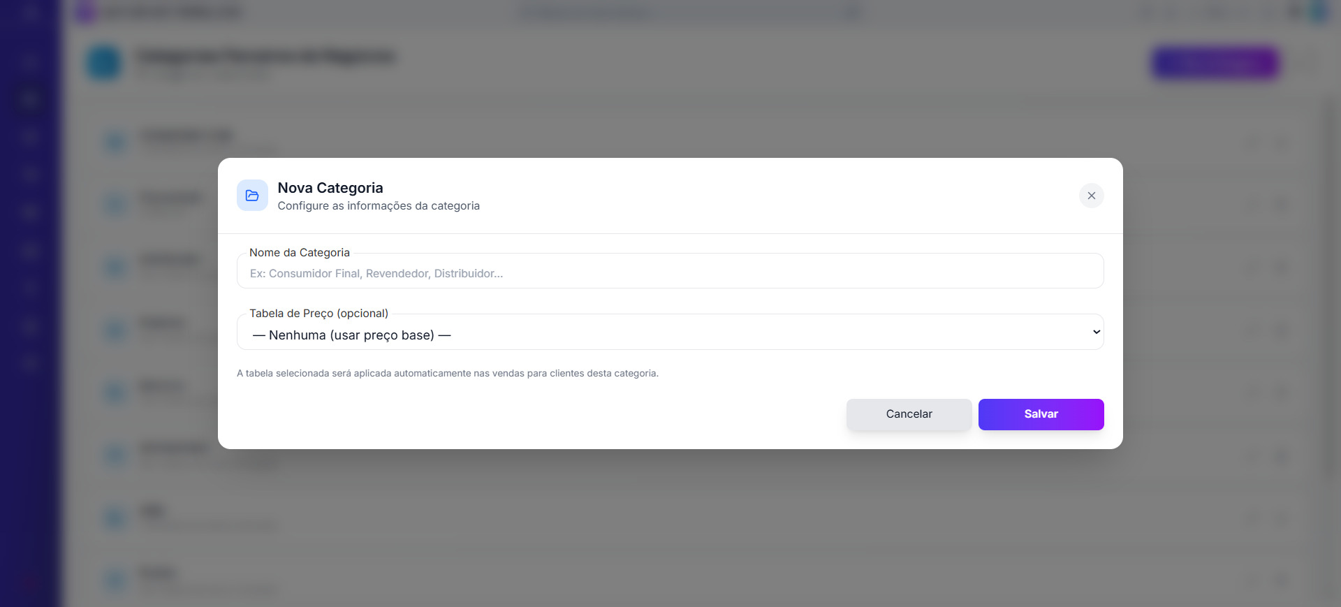 | Tabela de Preço | ❌ | Define qual tabela será aplicada automaticamente nas vendas para parceiros desta categoria |