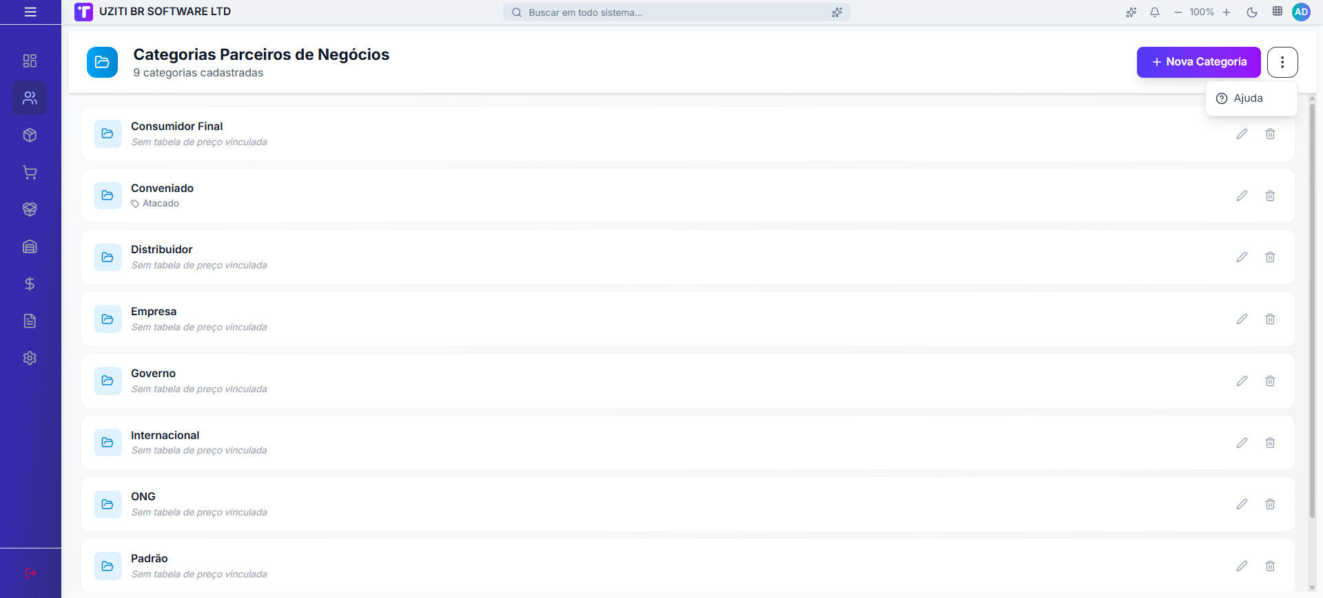 Antes de excluir uma categoria, verifique se ela ainda está sendo utilizada por parceiros ou em regras comerciais do sistema.