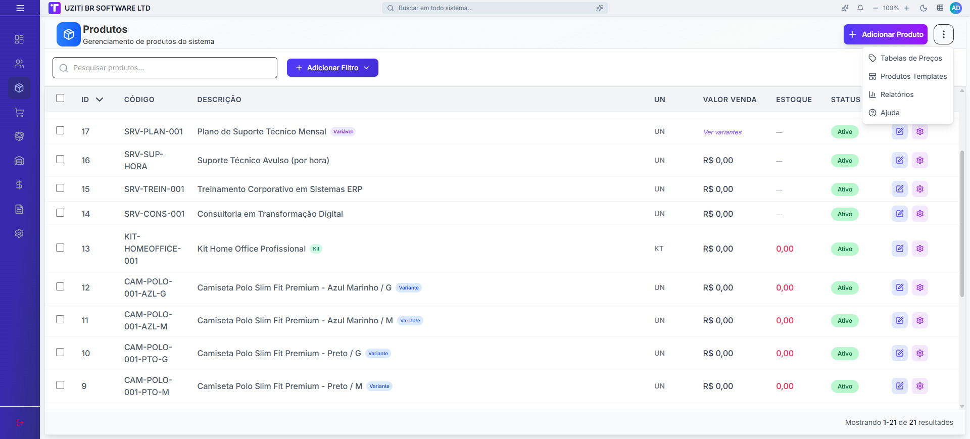 O módulo de Produtos centraliza o gerenciamento de todo o catálogo da empresa — produtos físicos e serviços — em uma única tela. Aqui você aprenderá a cadastrar, editar, pesquisar e gerenciar itens, além de configurar tabelas de preços e produtos templates.