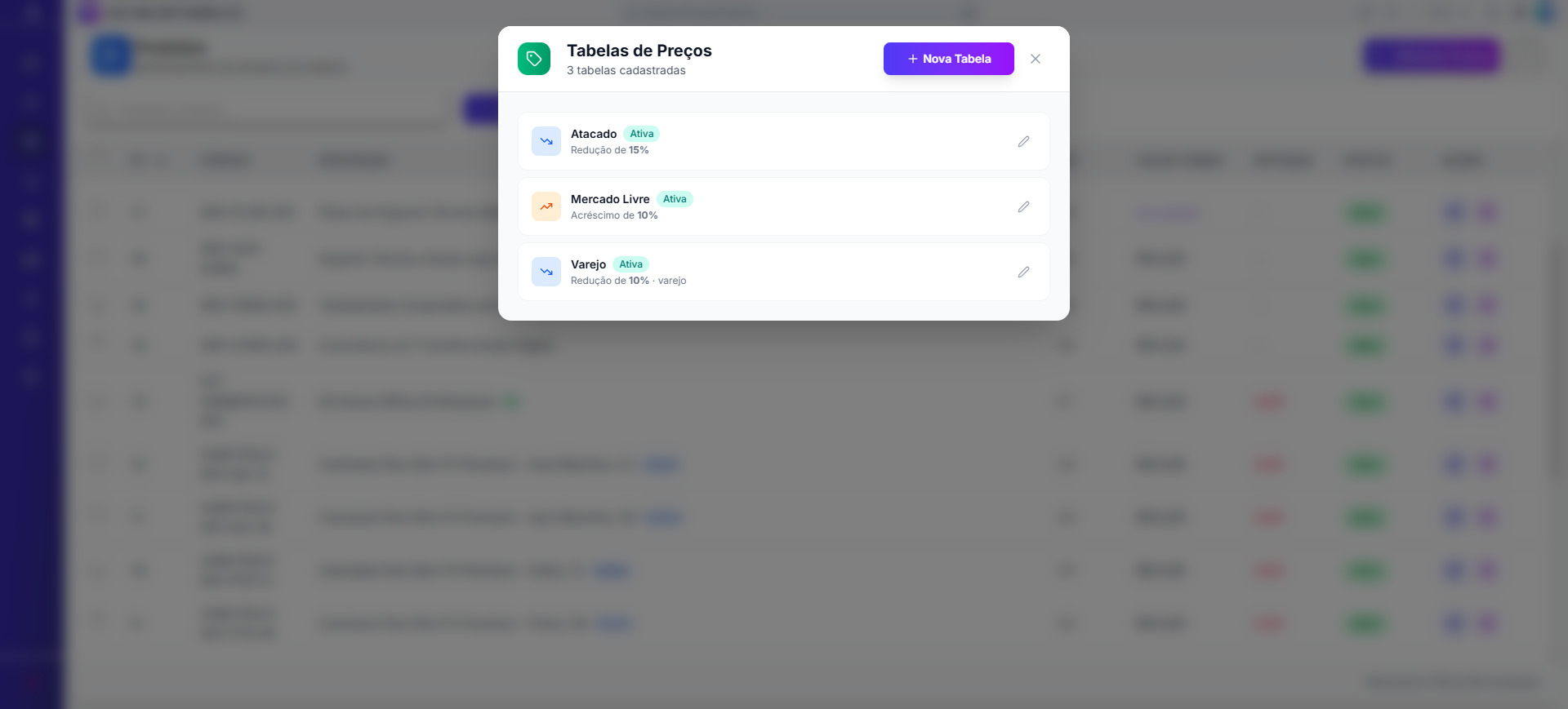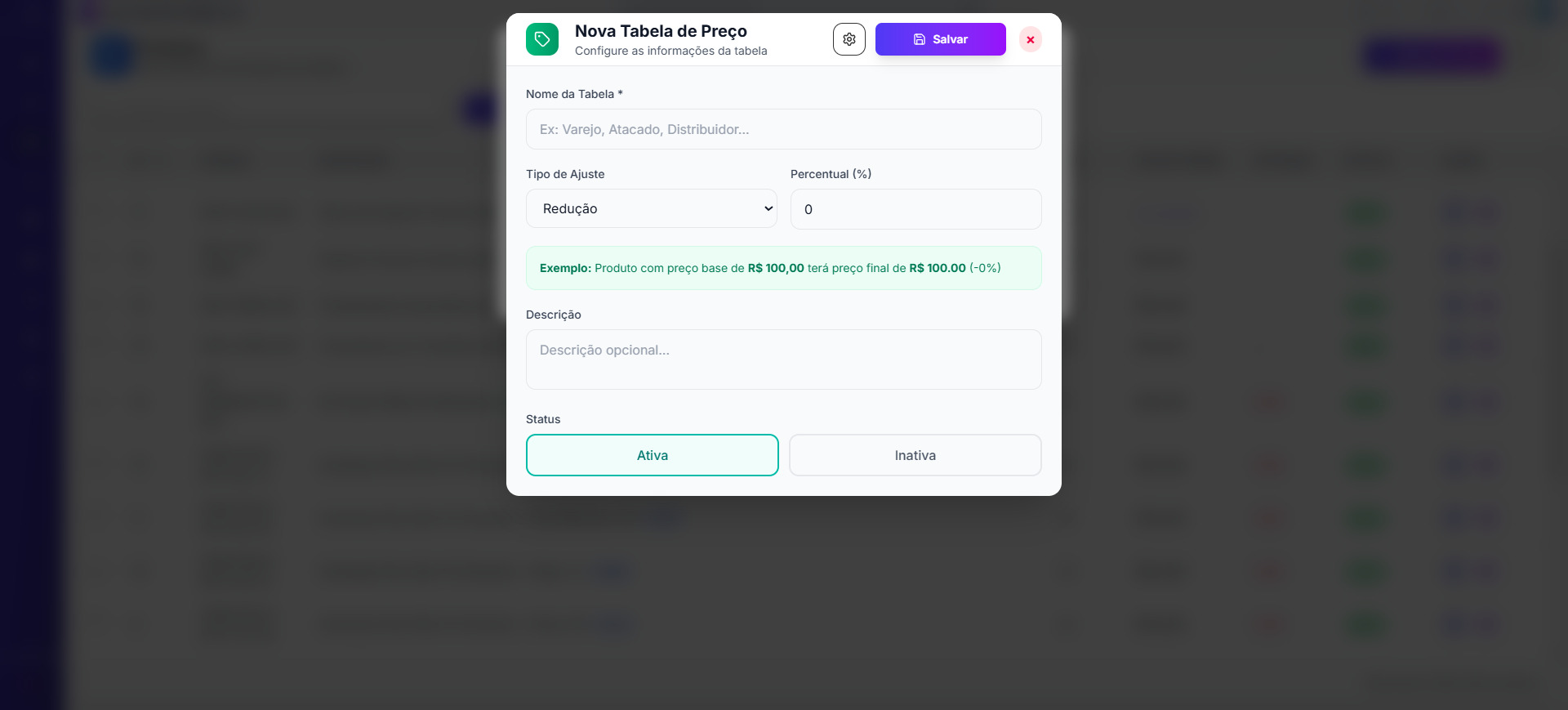 | Tabelas de Preços | Gerencie tabelas de preços com acréscimo ou redução percentual |