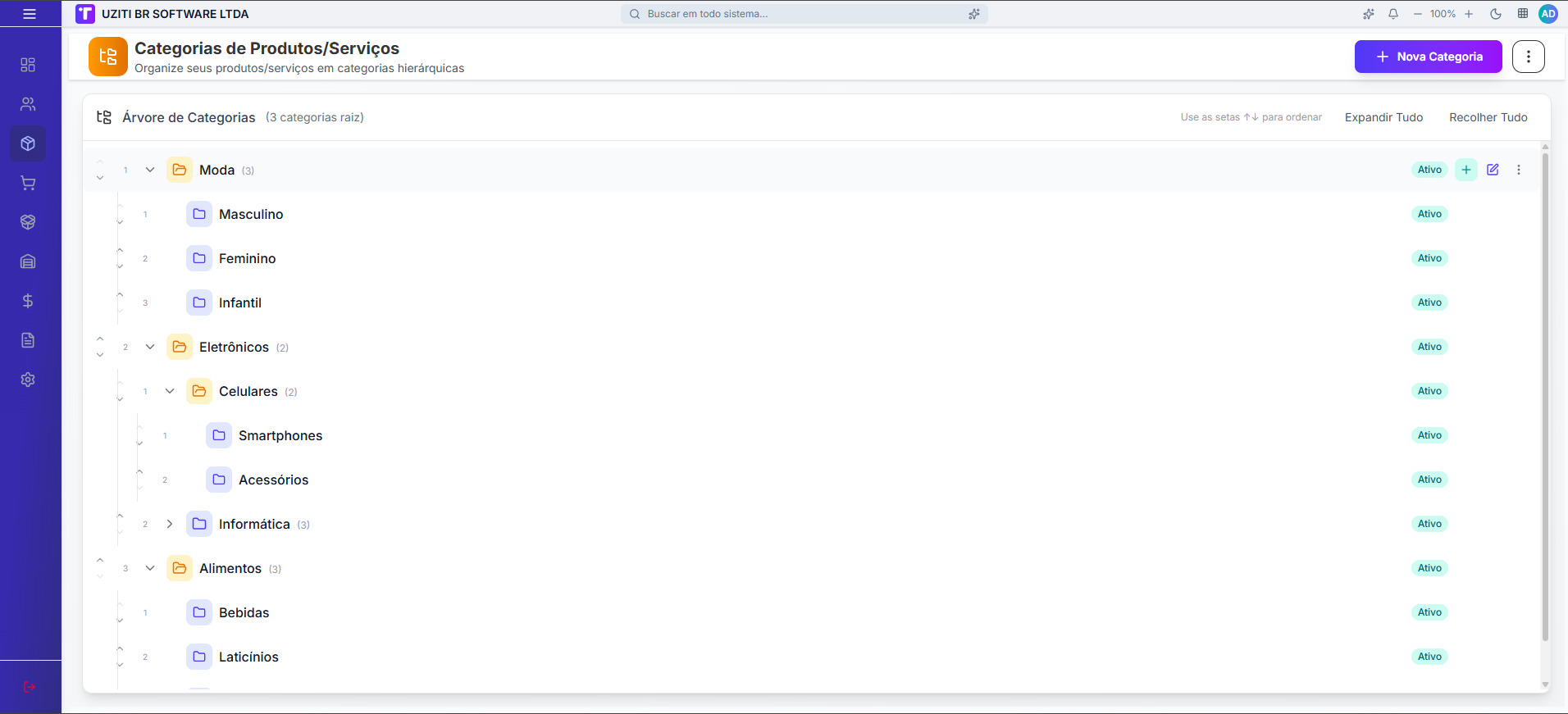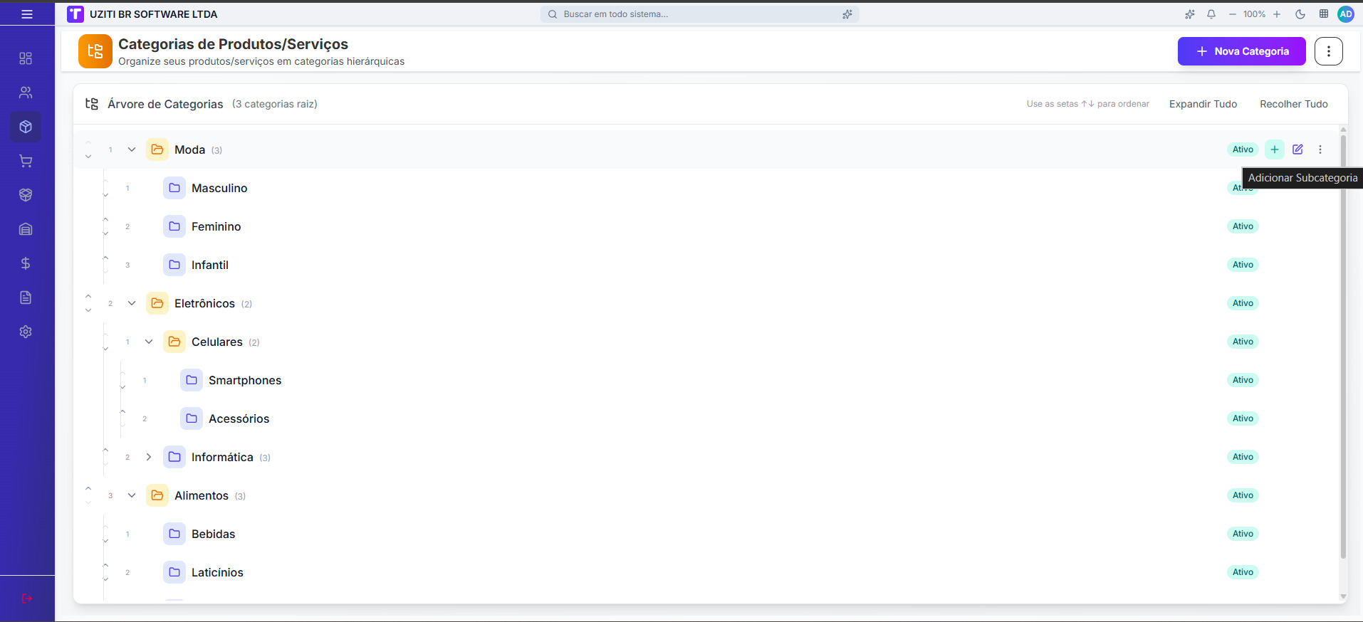O módulo de Categorias de Produtos/Serviços permite criar e gerenciar uma árvore de categorias para organizar o catálogo de produtos e serviços. As categorias podem ter múltiplos níveis (categoria raiz e subcategorias), ordenação manual e status (Ativo/Inativo).
