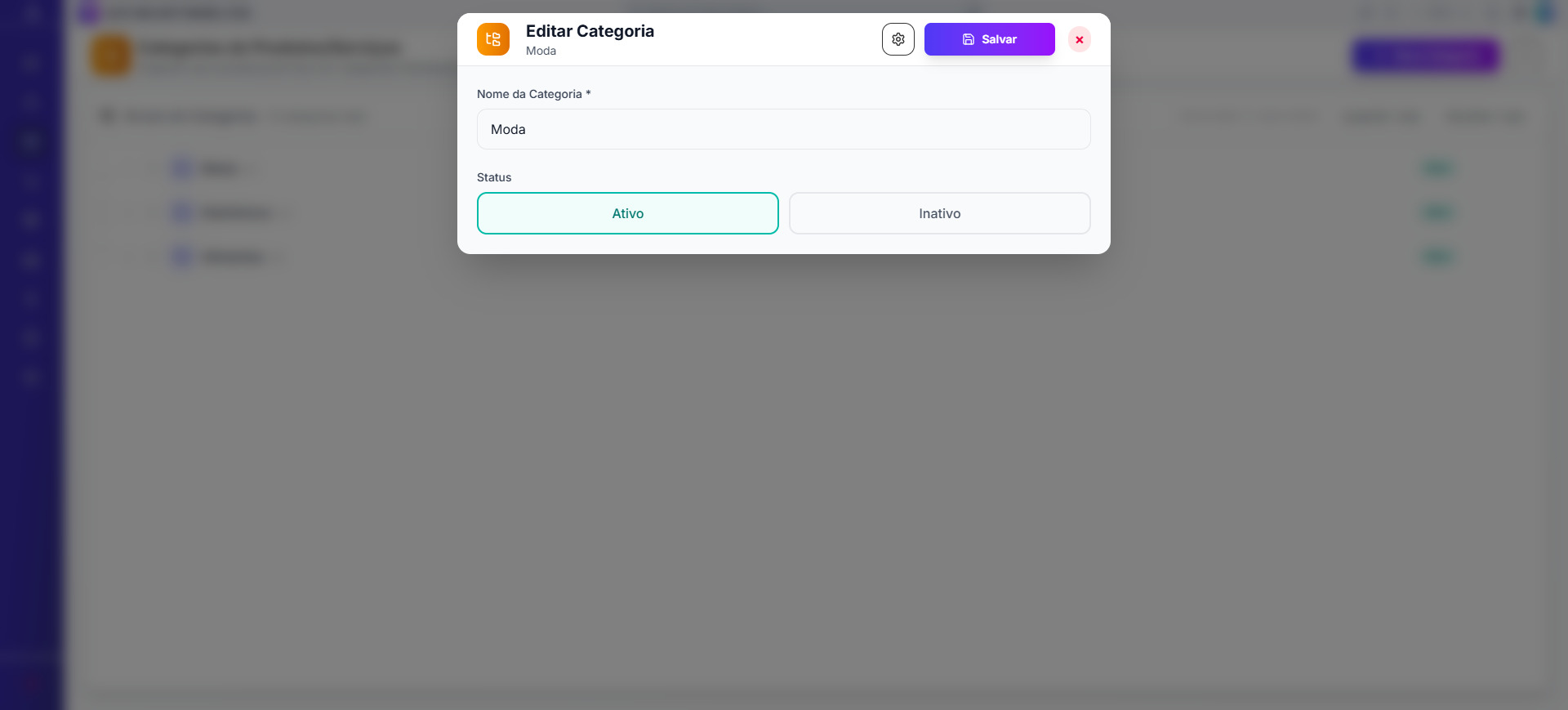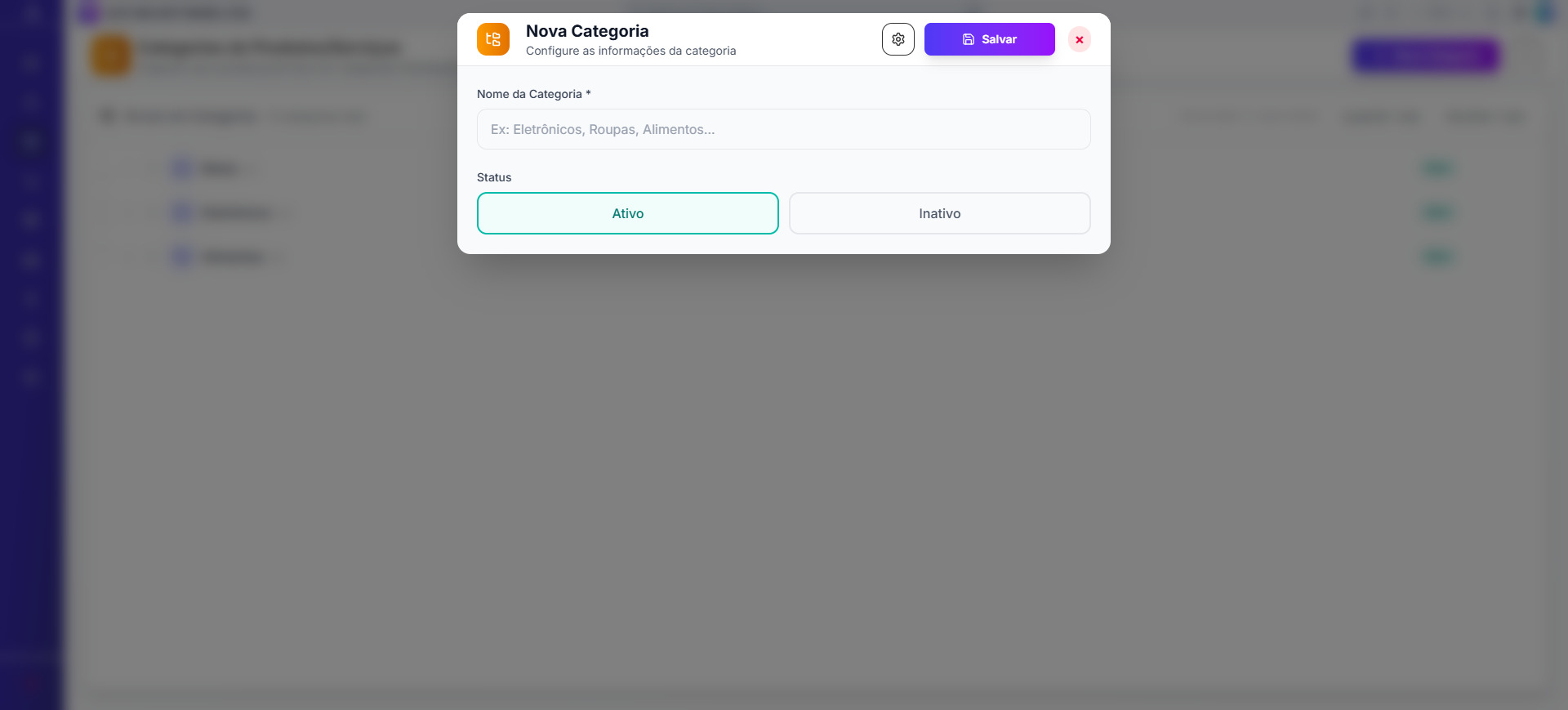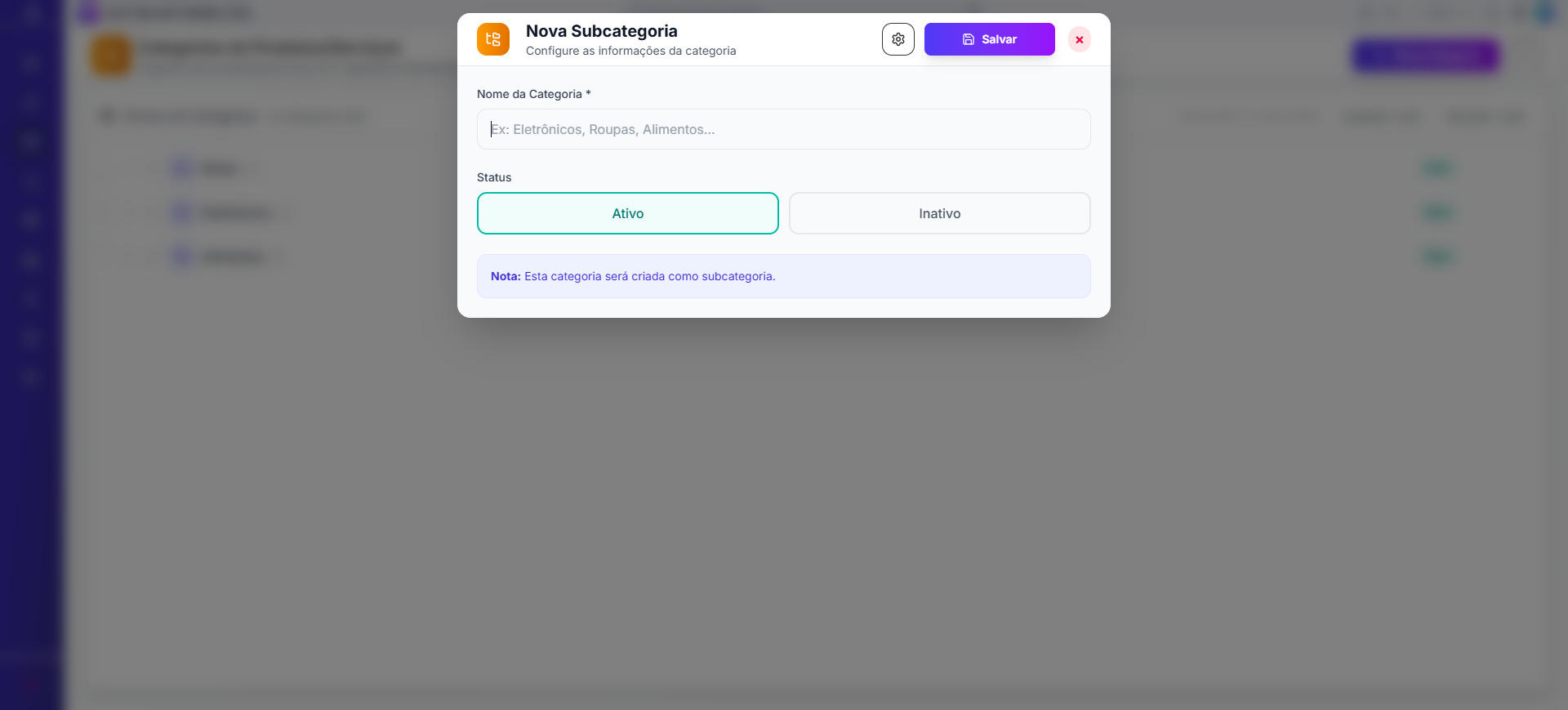 - Título: "Nova Categoria", "Nova Subcategoria" ou "Editar Categoria" conforme o contexto