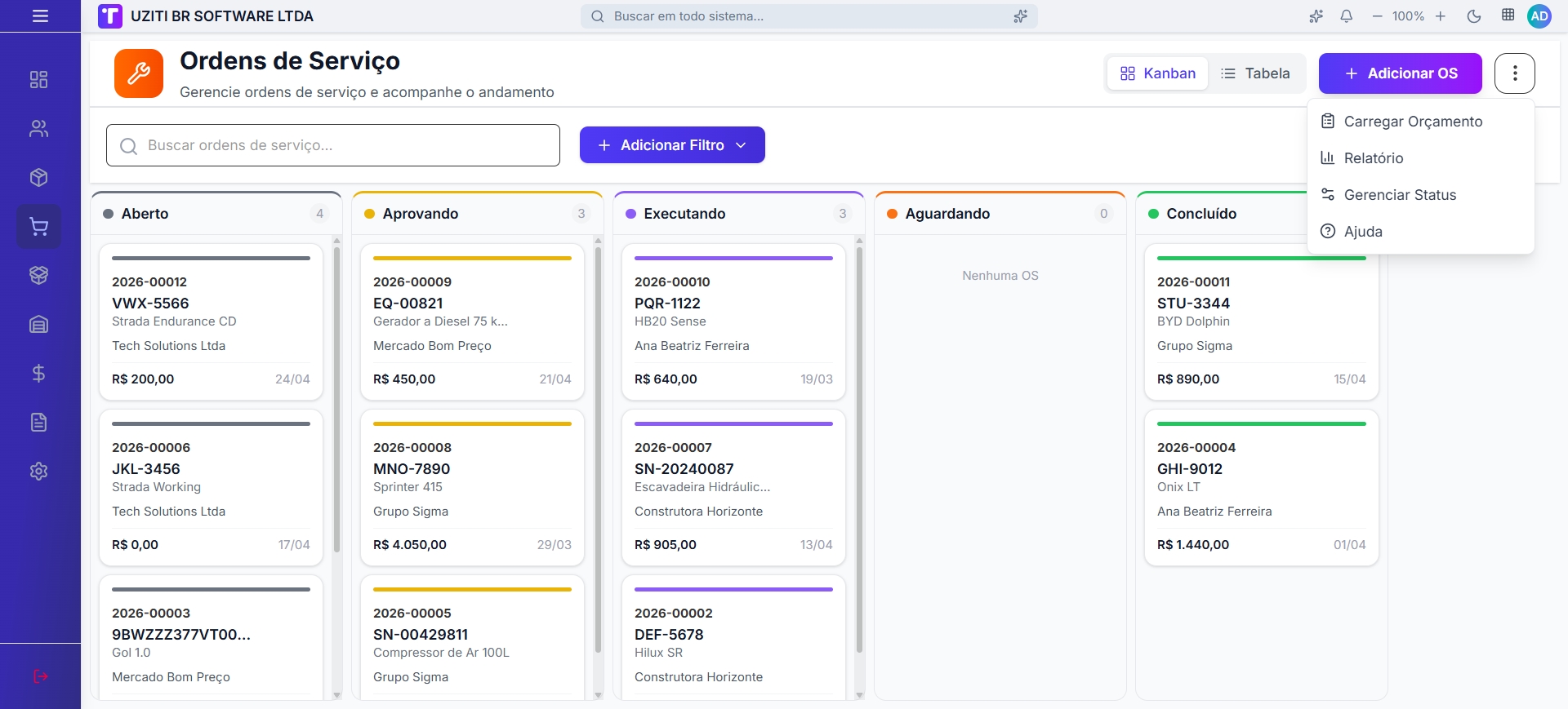 O módulo de Ordens de Serviço permite criar, editar e acompanhar as ordens de serviço (OS) em um quadro Kanban ou em Tabela. Cada OS pode conter dados de assistência (equipamento/veículo), cliente, produtos e serviços, checklist e observações. O sistema também permite gerenciar status personalizados, carregar orçamentos existentes para gerar OS e gerar relatórios e PDFs.