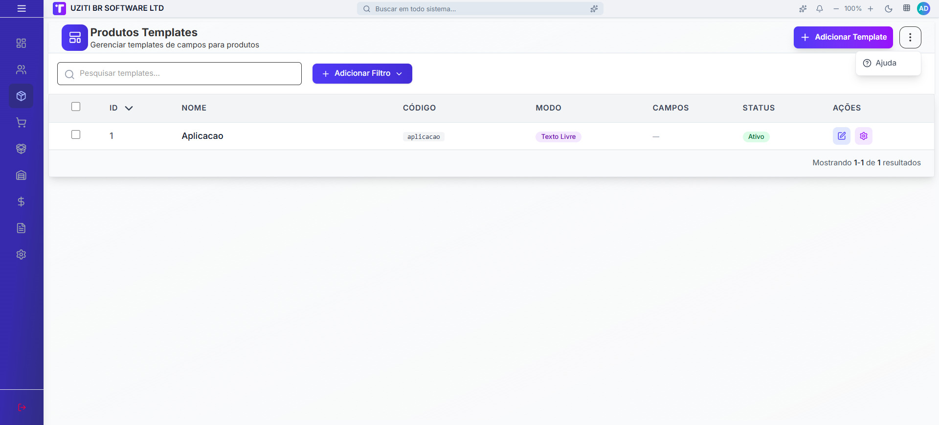 O módulo de Produtos Templates permite vincular e gerenciar os templates de aplicação associados a produtos, definindo quais estruturas de campos personalizados serão utilizadas no cadastro e nas operações de cada produto.
