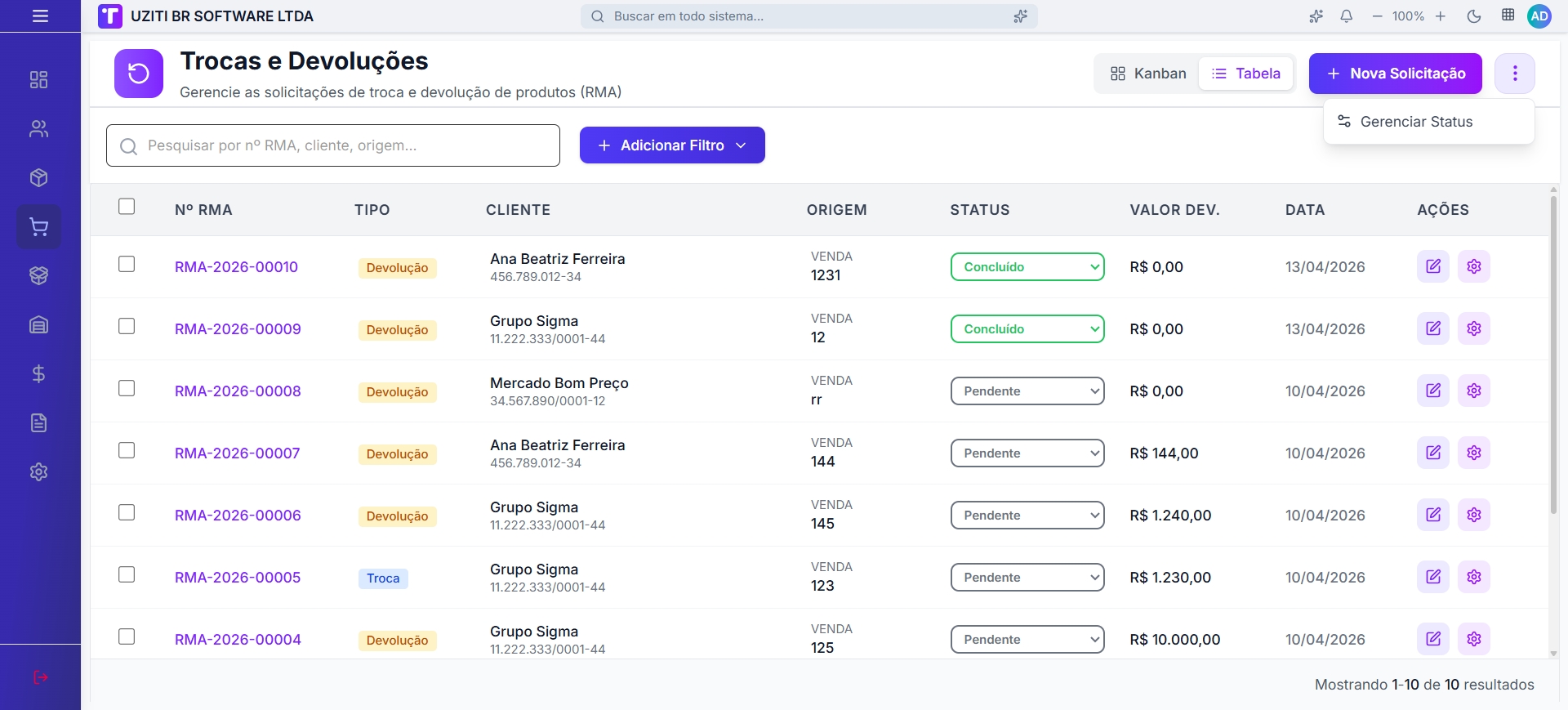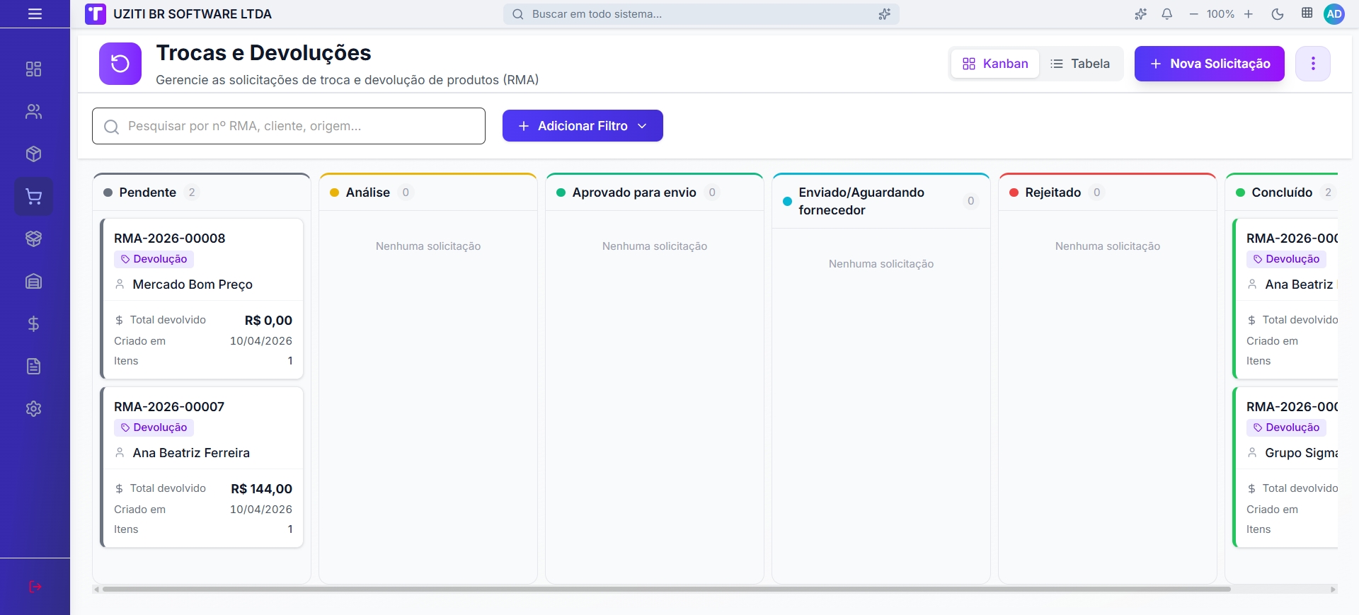 O módulo de Trocas e Devoluções permite gerenciar solicitações de troca e devolução de produtos (RMA — Return Merchandise Authorization). Cada solicitação passa por um fluxo de status configurável, podendo ser visualizada em Kanban ou em Tabela.