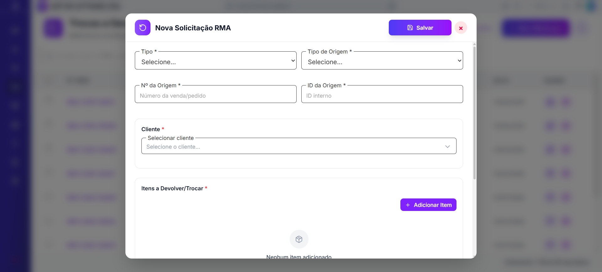| + Nova Solicitação | Abre o formulário de nova RMA |