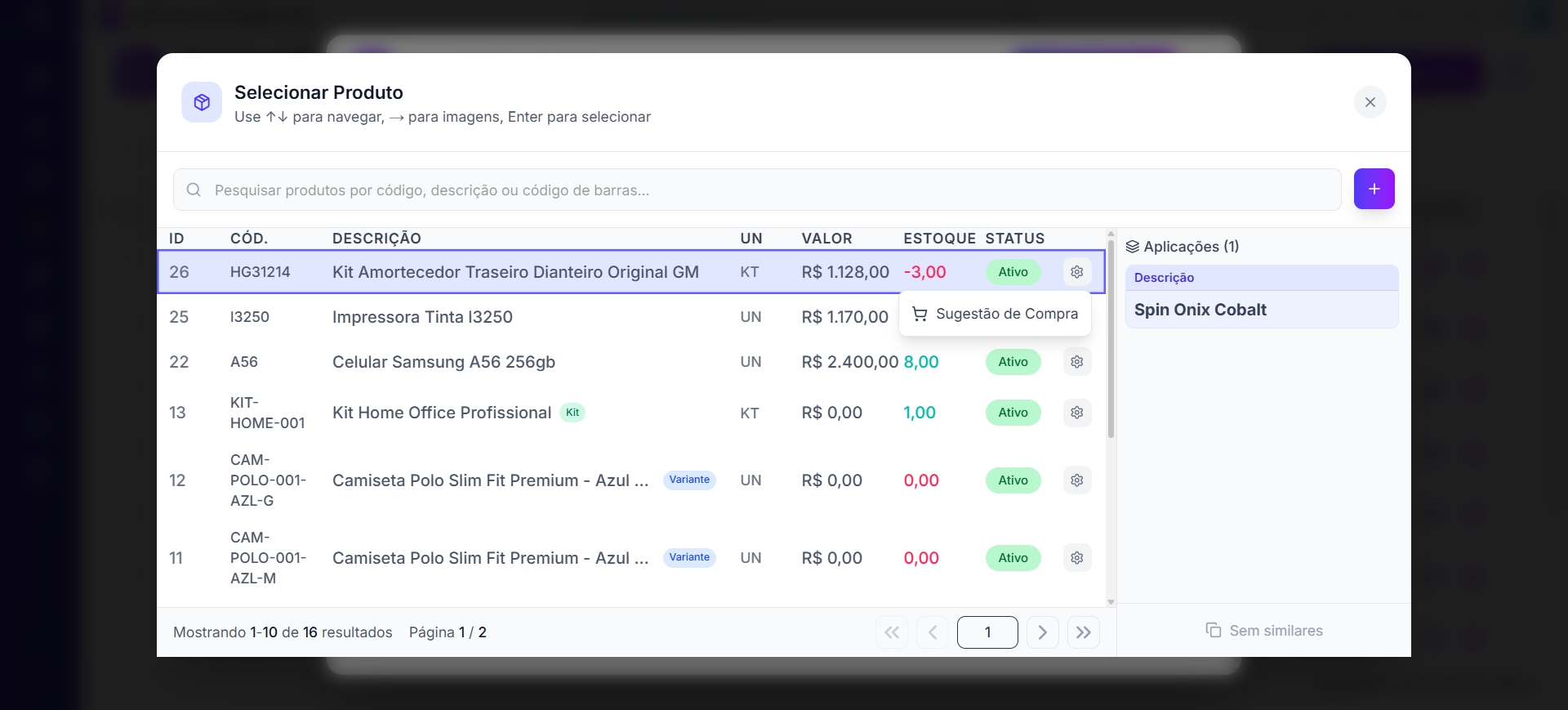 - Sugestão de Compra — exibe a sugestão de compra para o produto, com base no estoque atual, vendas recentes e lead time de reposição.