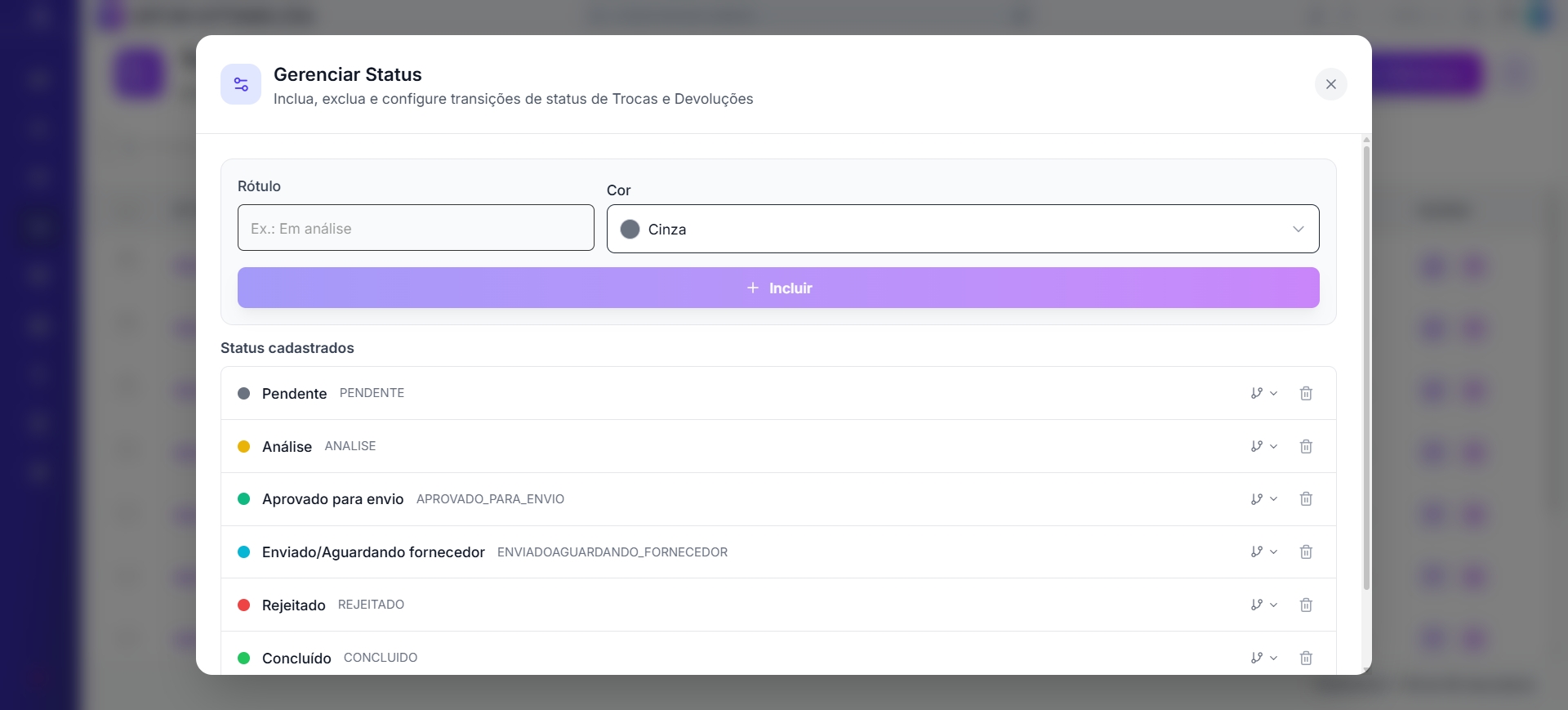 | Gerenciar Status | Abre o modal para criar, excluir e configurar transições de status |