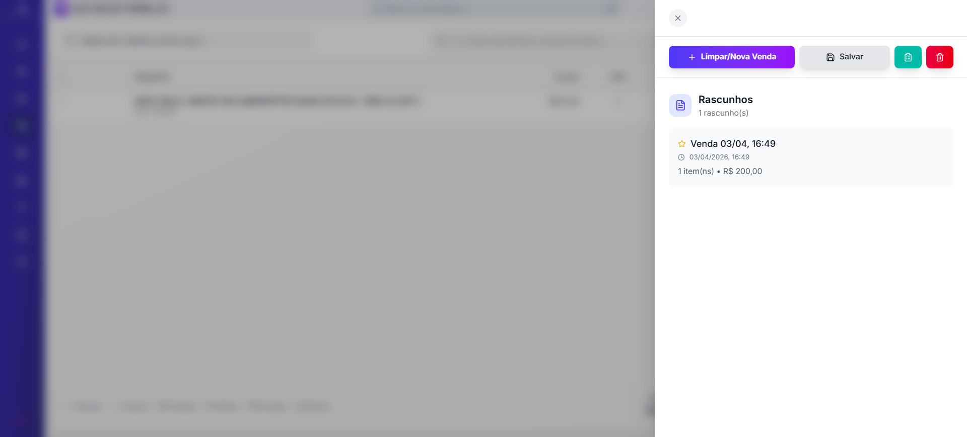 - Botão de rascunhos (ícone de documento) — abre o painel lateral de vendas em andamento