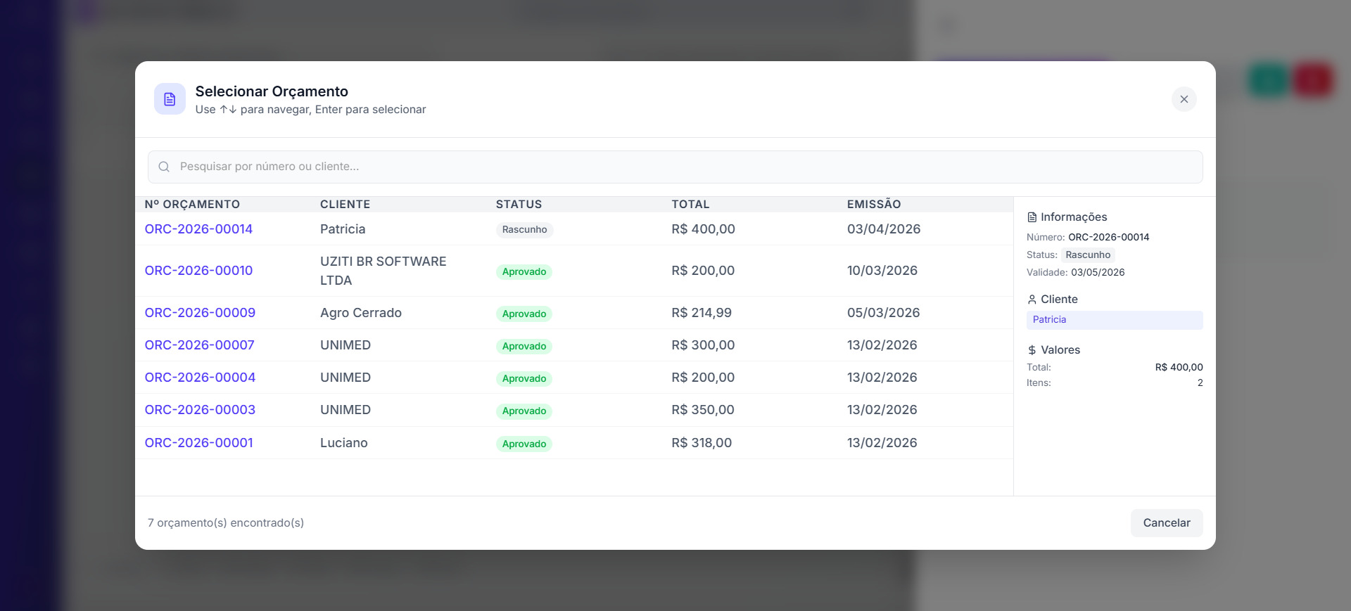 - Visualizar detalhes do orçamento selecionado no painel lateral direito: número, status, validade, cliente, total e quantidade de itens