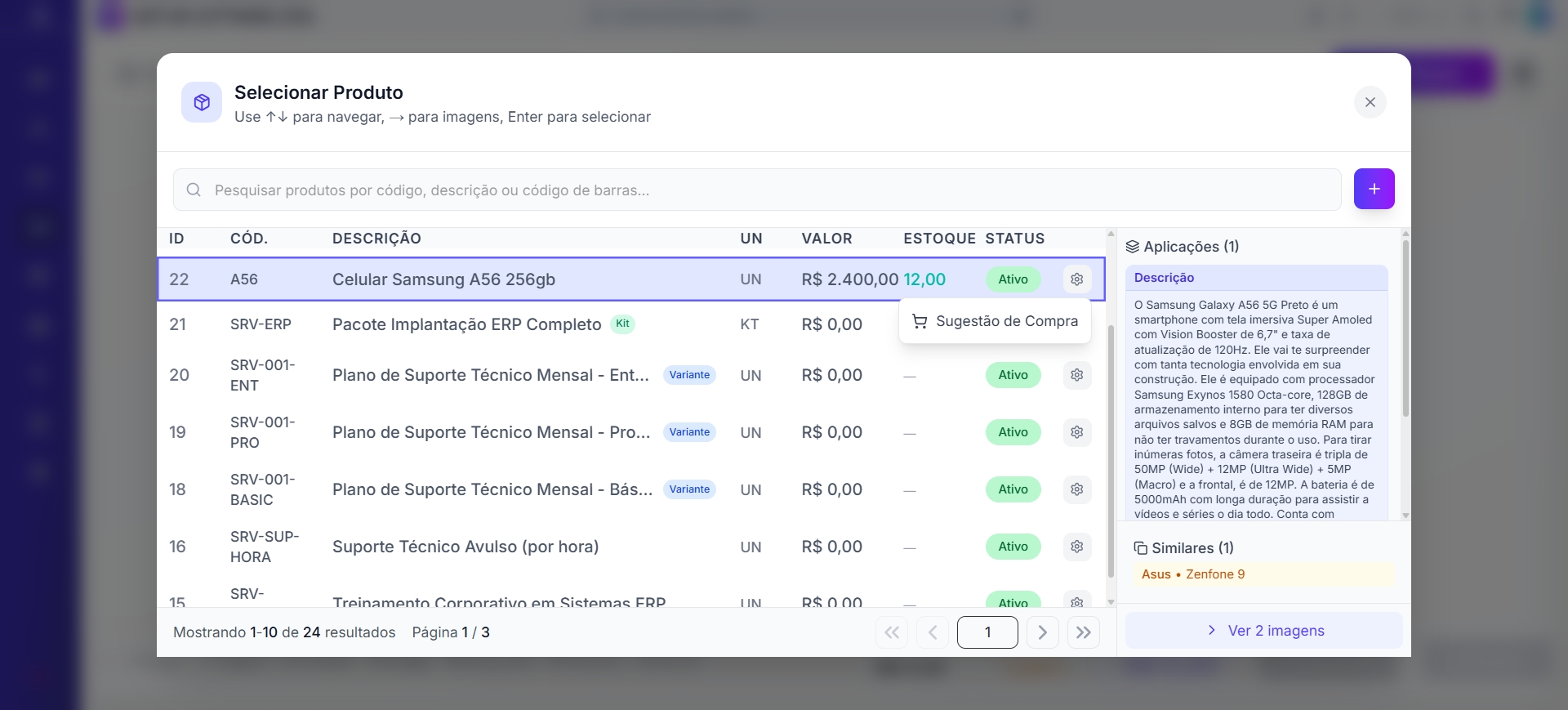 - Sugestão de Compra — exibe a sugestão de compra para o produto, com base no estoque atual, vendas recentes e lead time de reposição.